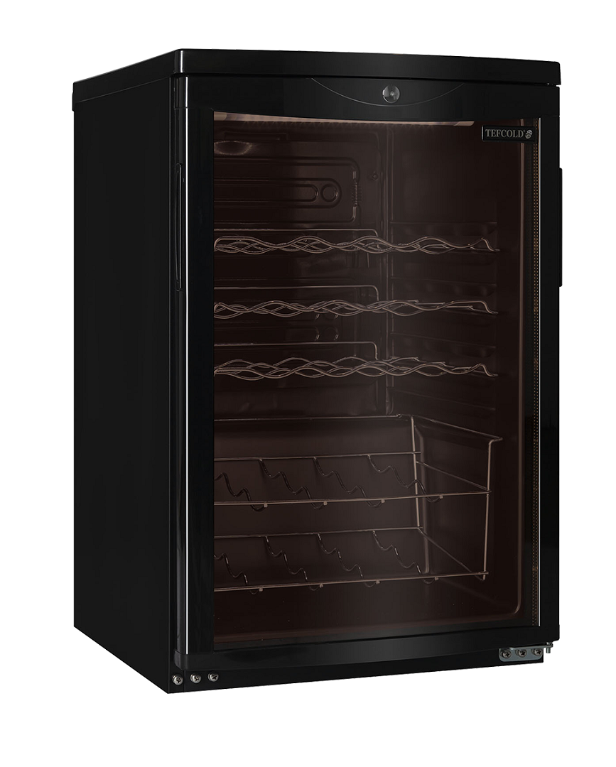 Un armario de vinos de primera calidad, con un elegante acabado negro. En su interior hay estantes para vinos que pueden contener hasta 22 botellas de 75cl, ideal para exhibir y almacenar vinos blancos y rosados. El dispositivo cuenta con ventilación asistida para garantizar un enfriamiento uniforme en todo el equipo y asegurar la temperatura de servicio de los vinos almacenados.
