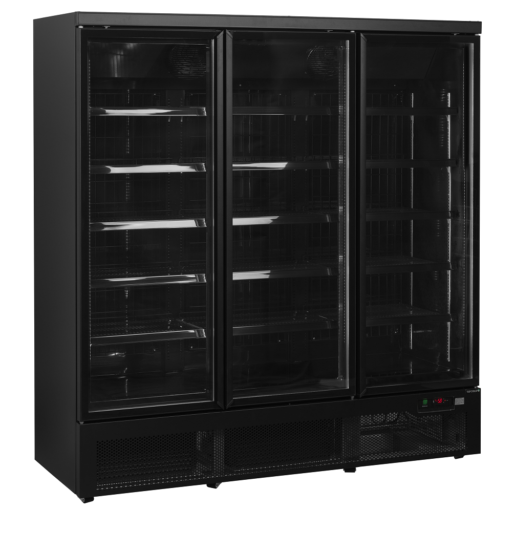 Perfecta exposición de alimentos congelados/Interior y exterior negro/Bajo consumo de energía/Puertas de cristal térmico de cierre automático/Triple acristalamiento aislante/Estantes ajustables detrás de cada puerta/Refrigeración forzada/Luz vertical interna LED/Base de acero inoxidable con efecto espejo/Control digital e indicador de temperatura/Disponible opción de abatidor