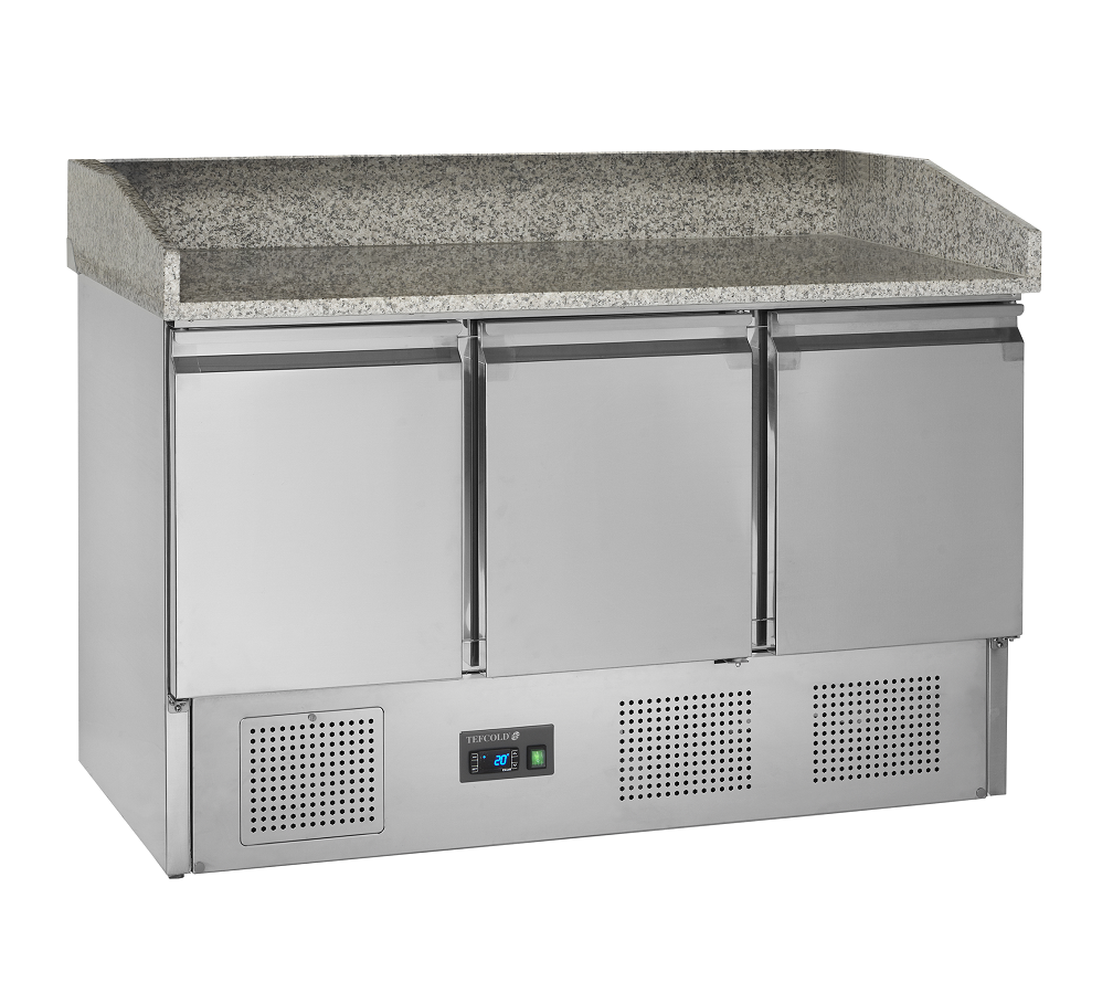 La gama PT de mesas para pizza está realizada en acero inoxidable SS304. Cuenta con una encimera de granito, que es ideal para elaborar pizzas, ya que se mantiene fría y dificulta que la masa se pegue a ella. Están disponibles en varios tamaños con 2 o 3 puertas. También es posible personalizarlas con cajones. Está disponible con o sin unidad de condimentos para bandejas GN1/3 las unidades de condimentos también se pueden incorporar posteriormente.