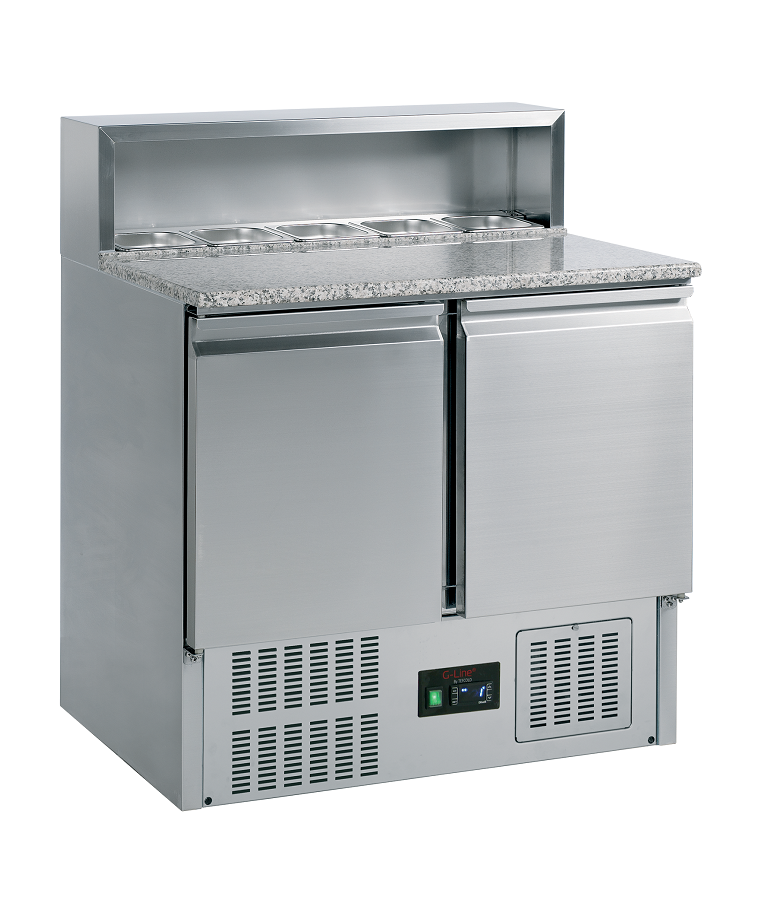 Mesa fría de pizza G-line, con una excelente relación calidad-precio, equipada con encimera de granito. Ideal para elaborar pizzas, ya que la encimera se mantiene fría y dificulta que la masa se pegue a ella. El hueco del mostrador admite bandejas GN de tamaño 1/6 y los armarios presentan las dimensiones de GN1/1.
