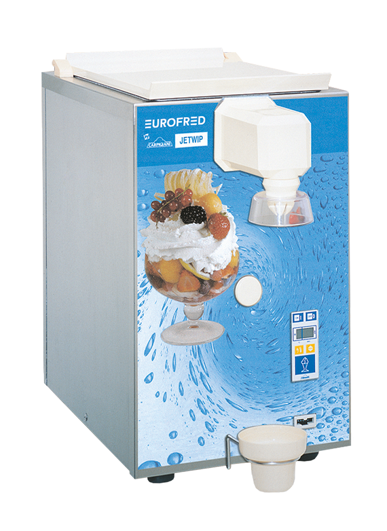 Montadora de nata con cuba de 6 litros. Es una máquina de gran capacidad productiva, de 240 l/h. Ideal para obradores de pastelería. Tanto la nata líquida como la montada se mantienen refrigeradas durante todo el proceso hasta llegar a la boquilla dispensadora.