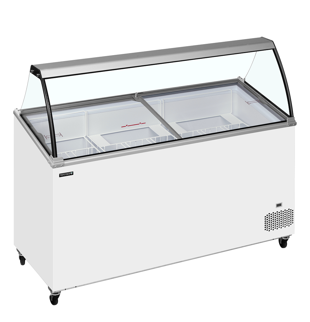 Pantalla higiénica en cristal curvado/Tapas deslizantes oblicuas con cierre/Excelente visibilidad del producto/Idóneo para la personalización con la marca/Almacenamiento bajo cestos/Termómetro digital/Ruedas giratorias con freno/Clase climática 5 para un alto rendimiento/Opcional: cubetas para tarrinas de plástico/Este modelo es compatible con 11 tarrinas de plástico de 5 l