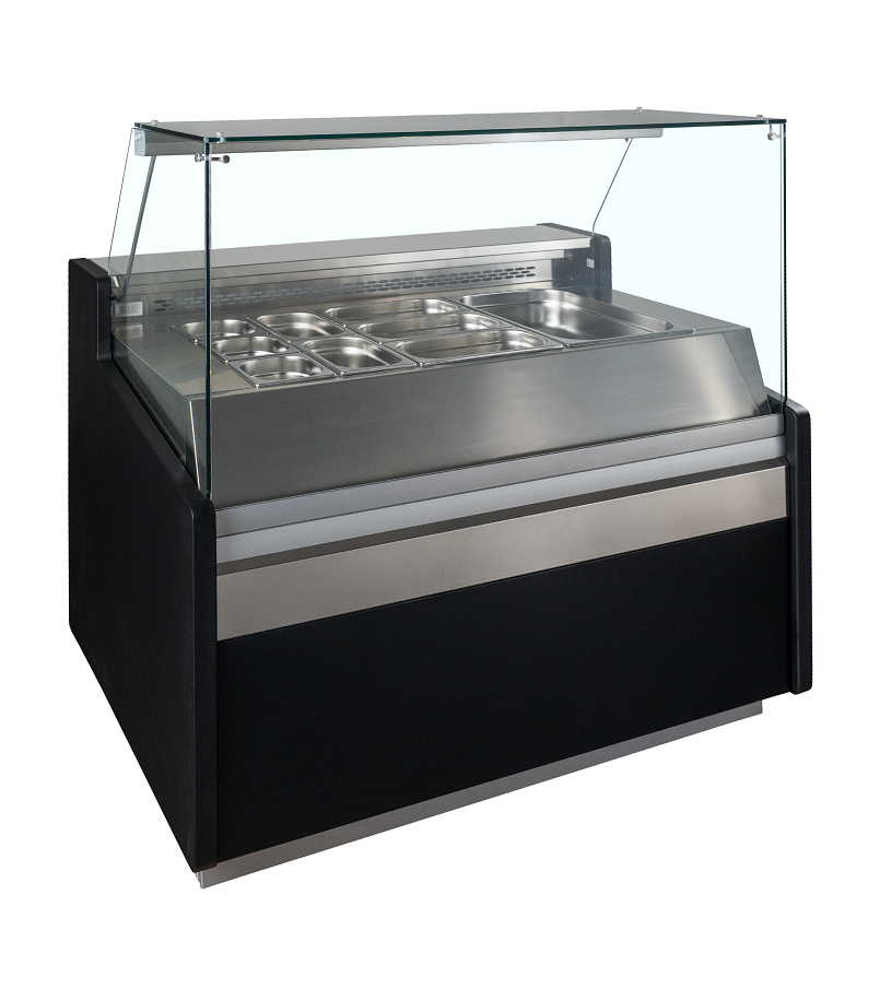 Excelente visibilidad de producto/Estructura de cristal para proteger los alimentos/Bisagras de cristal frontal hacia delante si se requiere/Acepta bandeja(s) GN1/1 (no suministrada/s)/Compartimento de almacenamiento de fácil acceso/Exterior negro/Refrigeración forzada/Descongelación automática/Luz interior LED