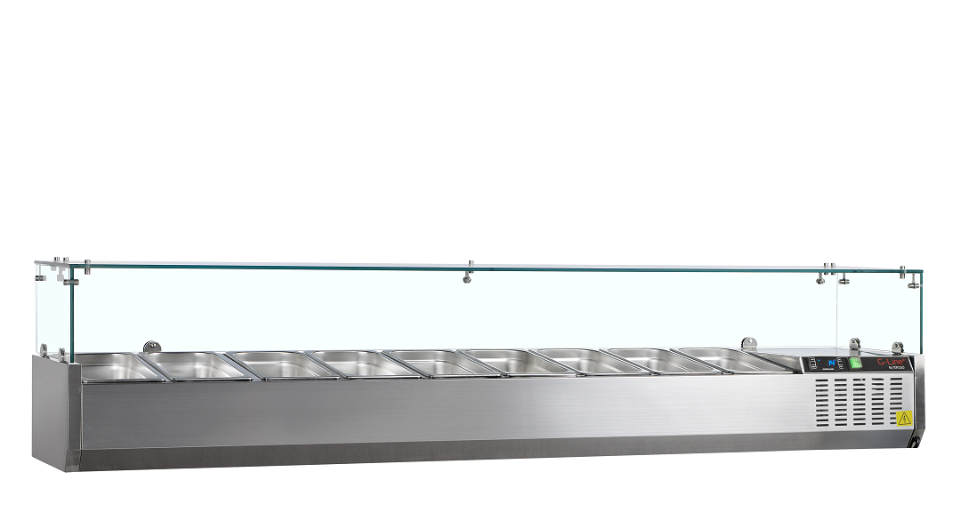 Acero inoxidable/Estructura de cristal para proteger los alimentos/Acepta bandejas GN1/3 (no suministradas)/Control digital e indicador de temperatura/Refrigeración estática/Patas regulables