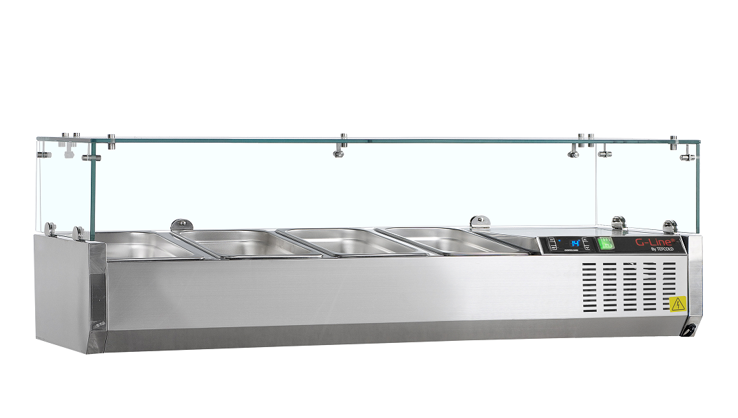 Acero inoxidable/Estructura de cristal para proteger los alimentos/Acepta bandejas GN1/3 (no suministradas)/Control digital e indicador de temperatura/Refrigeración estática/Patas regulables