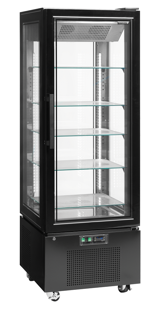 El expositor UPD400-F con puertas de cristal ofrece una elegante solución para la presentación de postres. Este congelador cuenta con doble acristalamiento en los cuatro lados, incluida una puerta de cristal sin marco. Su diseño es moderno, con el exterior en acero negro, el interior en acero inoxidable, 5 estantes de cristal ajustables e iluminación LED.